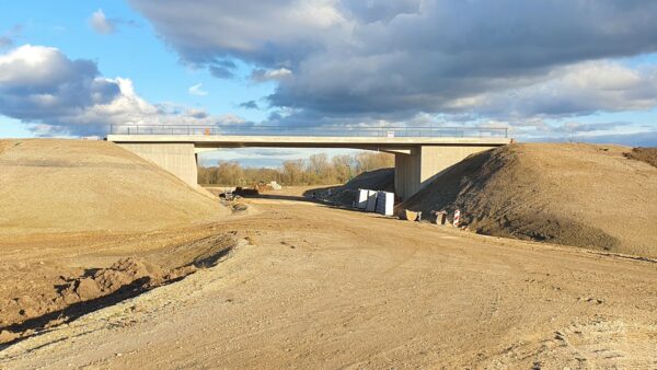 For this purpose, a low-maintenance, integral bridge structure with a span of approx. 24 m was designed. The frame-like supporting structure with a slim superstructure was completed in mid-2023. In the meantime, road construction work continued and the structure was integrated into the access ramps.