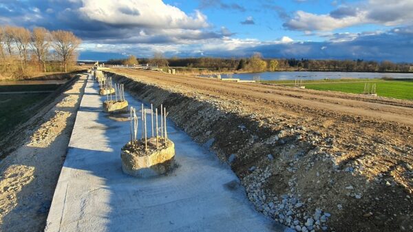 For the planned cross-section of the B311 to the B30 south of Erbach, noise and pollution protection walls approximately 850 m long are planned on both sides in the road embankment area to protect the biotope complex of the Danube and the Danube Canal. For the noise barrier construction, a color and design concept was developed together with the architectural firm arch22 Bogenrieder Crumbach, which provides alternating gabion and colored aluminum wall sections. Bore pile work has now been completed and construction of the continuous pile cap beams has begun.